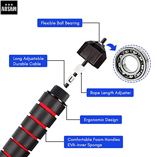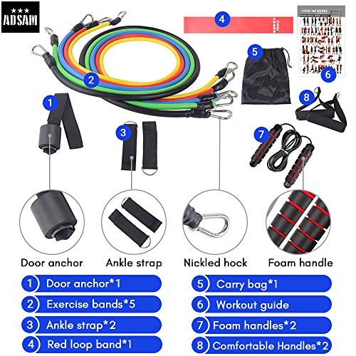 *QUALITY AND PROFESSIONAL SET: 5 bands made of 100%natural LATEX: Yellow 10lbs, Red 15lbs, Blue 20lbs, Green 25lbs, Black 30lbs. And our popular wire inner skipping rope with Ball bearing system to make it relaxed and balanced rotation. We add a free loop band with the set to meet all the training needs as a single kit