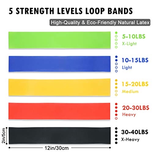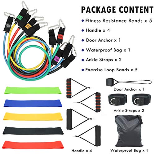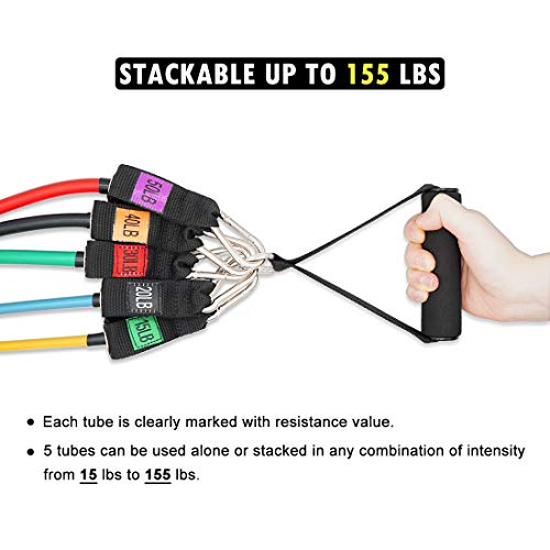 Resistance Bands Set 155 lbs. Stackable: 5 x Fitness Resistance Bands, 5 x Exercise Resistance Loop Bands, 2 Pairs of Resistance Band Handles, 1 Pair of Exercise Ankle Straps, 1 x Door Anchor, 1 x Travel Carry Bag.